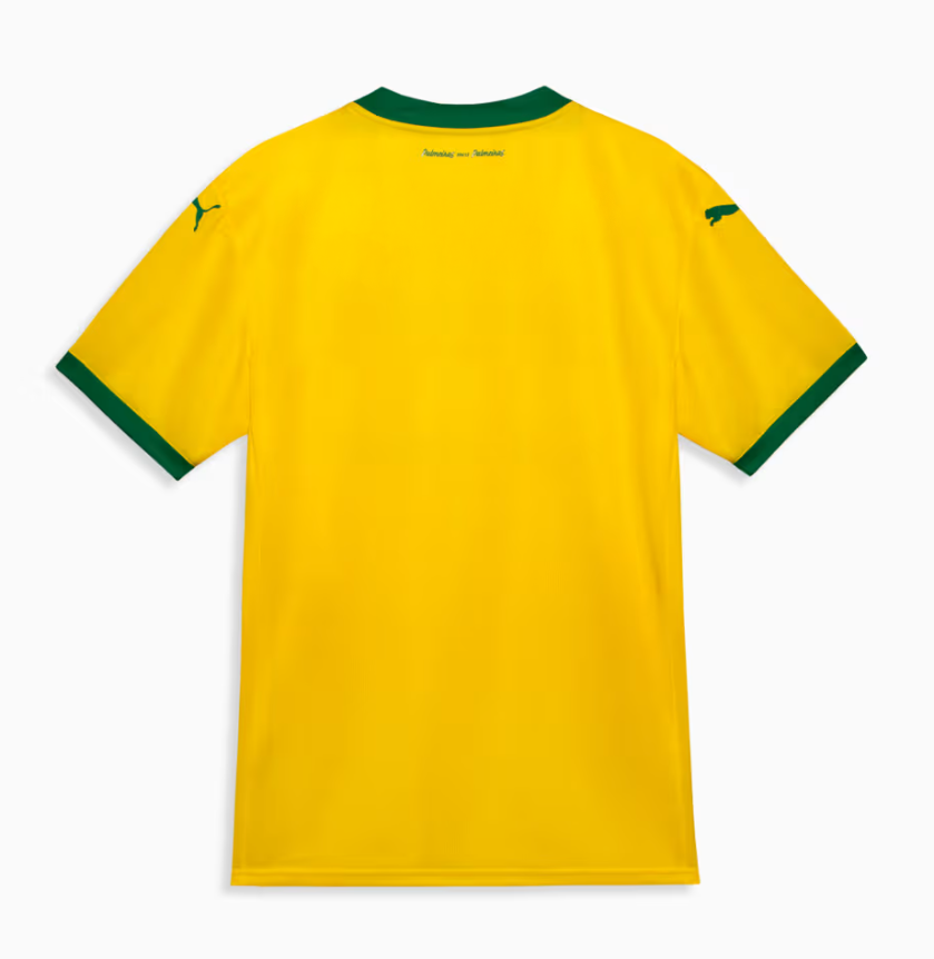 Camisa amarelo ouro com detalhes em verde e branco.